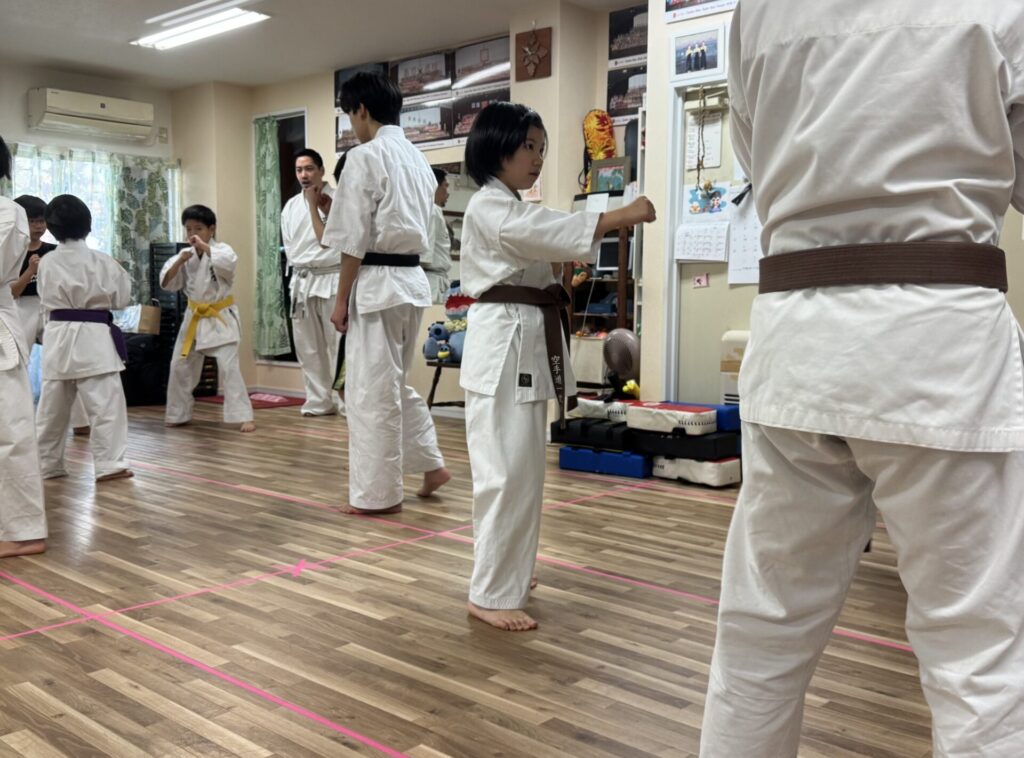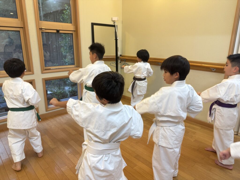 幼児・小学生の合同クラスです。突き、蹴り、立ち方、受け技など空手の基本稽古やミット打ち等を中心に練習します。
